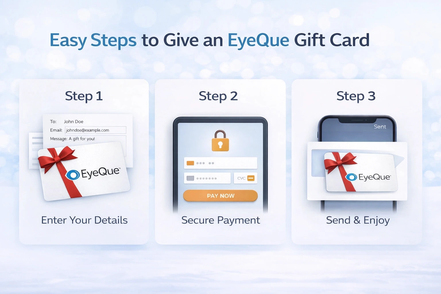 We instantly send the digital gift card to the recipient’s inbox. They can redeem it anytime toward EyeQue devices and start testing their vision at home.